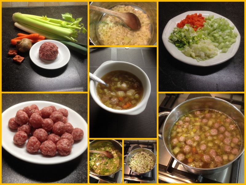Kruid ondertussen het gehakt met peper en zout en draai hier gehaktballetjes van .Ik gebruik meestal gehakt van de slager die al gekruid is. Voeg na 20 minuten de gehaktballetjes bij de soep en kook ze de laatste 10 minuten mee. Breng eventueel nog op smaak met peper en zout en/of gebruik gesneden verse kruiden zoals peterselie en bieslook